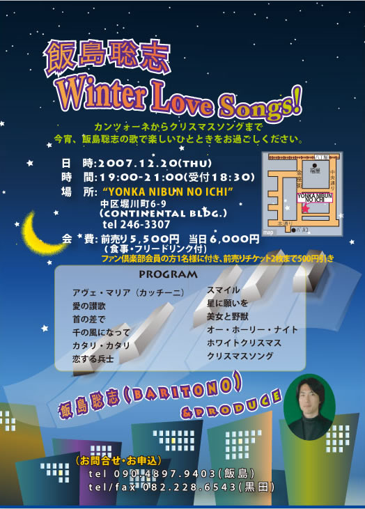 身が引き締まります(^ ^) 体重は少し増加傾向にありますが・・・ 今年最後の大きなコンサート その名も 飯島聡志 ウィンター・ラブソングス 昭和の香り漂うタイトルですが 気に入っています ![]() プログラムは アヴェ・マリア(カッチーニ) 愛の讃歌 首の差で 千の風になって カタリ・カタリ 恋する兵士 スマイル 星に願いを 美女と野獣 オー・ホーリー・ナイト ホワイトクリスマス クリスマスソング です。 前半は今年歌った歌の中でも特に気に入ったものを 後半はクリスマスを意識したものを歌います。 今年一年の感謝と 年忘れのイベントとして歌い上げます(^ ^) 是非お越しください☆ 前回のカンツォーネ・ナイト同様売り切れの場合がございますので 来ていただける方はお早めにお申し込みください。 日時:2007年12月20日 開場18:30 開演19:00 会場:yonka nibun no ichi 3階 会費:前売り5500円 当日6000円 (ファン倶楽部会員の方は1名様につき前売りチケット2枚まで500円引き) 食事・フリードリンク付きです。 会場のyonka nibun no ichiは パルコ本館前の廣文館の向かいにあるカフェです。 お問い合わせ・チケットのご用命は隣のメールフォームまでお気軽に。 PR