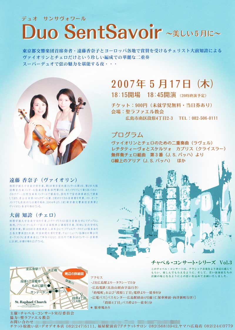 聴いていただきましょう! ラヴェルといえば 「ボレロ」http://www.youtube.com/watch?v=ggsCw4i0S-U 「水の戯れ」http://www.youtube.com/watch?v=cumoVX7x3Zo 「亡き王女のためのパヴァーヌ」http://www.youtube.com/watch?v=PCDfcWY7ryA なんかが有名ですね。 ラヴェルは器楽曲などをオーケストラのために編曲をするのが すごく上手で「オーケストレーションの魔術師」なんて呼ばれたりもします。 例えばしばしば耳にする「展覧会の絵」。 もともとはムソルグスキーという作曲家がピアノ曲として 作曲したものです。http://www.youtube.com/watch?v=OK7I284Xf3k ムソルグスキー自身この曲をオーケストラのために 編曲したかったようなのですが、かなわぬままに亡くなってしまいました。 では今日オーケストラで頻繁に演奏されているのは・・・? これがラヴェルの編曲によるものなのです。 http://www.youtube.com/watch?v=k_98452AxFI さて、前置きが長くなりましたが・・・ 今回チャペルで演奏される「ヴァイオリンとチェロのためのソナタ」。 ラヴェル自身がこの曲に対して 「私の生涯に一つの曲がり角を画したものである」 と、語っているのですが まさにそのとおりで ラヴェル独特のきれいな和音や旋律を イメージして聴くとちょっとびっくりするかもしれません。 ですが、もしかすると普段クラシックをあまり聴かない人にとっては ちょっとロックに近いような部分もあるので クラシックに対する見方が変わるような曲でもあるかもしれません。 では「ヴァイオリンとチェロのためのソナタ」から第二楽章を お聴きください(^ ^) http://www.youtube.com/watch?v=482LKpVDqBc どうでしたか? |